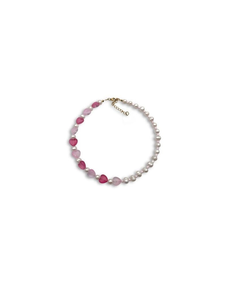 El collar Amour es una pieza romántica que combina perlas de agua dulce con cuentas de cristal en forma de corazón. Los suaves tonos rosa y fucsia le dan un toque femenino y divertido, mientras que las perlas auténticas le aportan elegancia y un encanto atemporal. Un collar llamativo que destaca en cualquier atuendo.