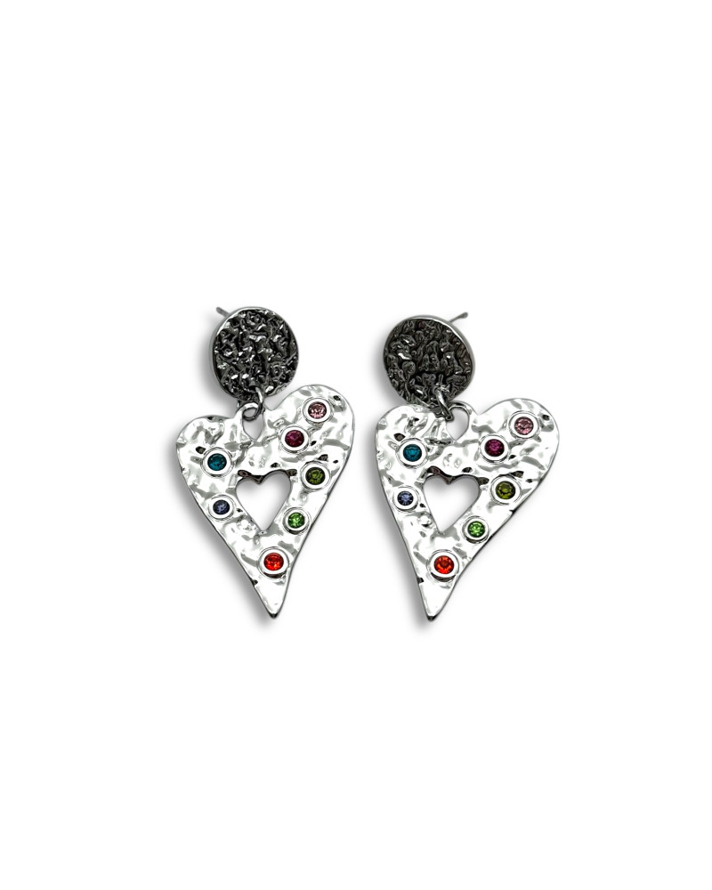 El acabado martillado aporta profundidad y carácter, mientras que las piedras de colores aportan energía y contraste. El centro abierto del corazón realza su toque moderno, haciendo que los pendientes sean ligeros pero impactantes.