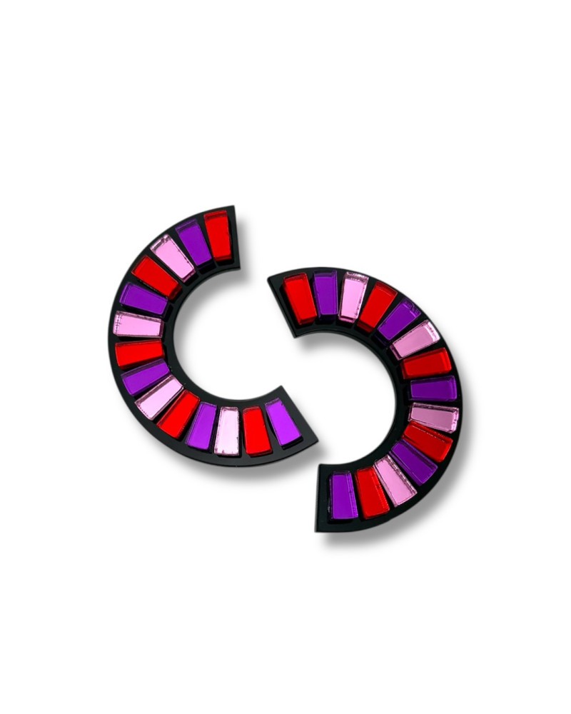 Movimiento, ritmo y colo. Hechos a mano en plexiglás con vibrantes tonos rojos, rosas y morados, estos pendientes forman un dinámico semicírculo que transforma la geometría en moda. Su diseño celebra la individualidad, la alegría y el pulso del arte moderno: un eco portátil de audaz autoexpresión.