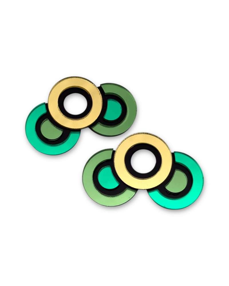 Una fusión lúdica de círculos y reflejos. Estos pendientes combinan espejos dorados con tonos de plexiglás verde, creando un diseño geométrico que se mueve con cada paso. Atrevidos, brillantes y diferentes.
