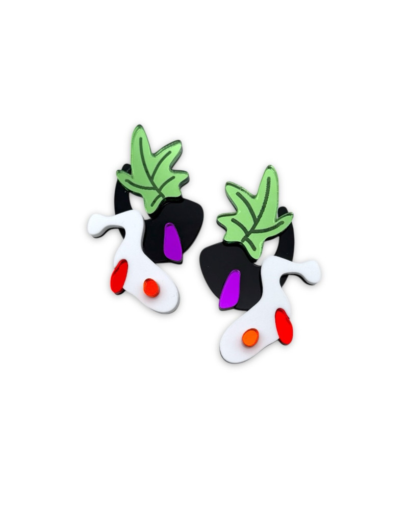 ¡Naturaleza, color y actitud en un solo par! Los pendientes Rábano transforman el humilde rábano en una pieza de arte pop impactante. Hechos a mano en plexiglás con vibrantes tonos de blanco, verde, negro y rojo, combinan humor con un estilo sofisticado: un diseño original y lleno de vida.